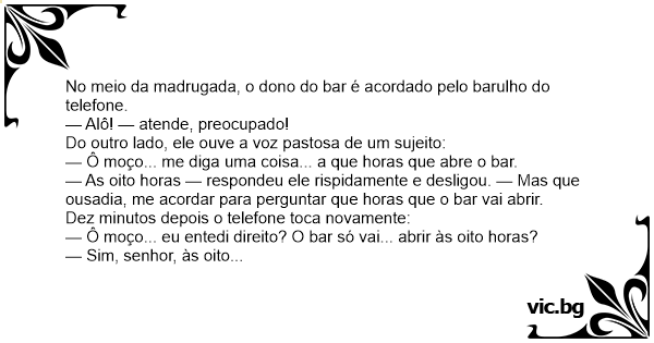 — As oito horas — respondeu ele rispidamente e desligou. — Mas que ousadia, me acordar para perguntar que horas que o bar vai abrir.
