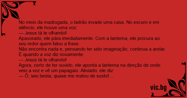 Um ladrão entra em uma casa e já vai logo roubando tudo,quando ouve: — Jesus tá te olhando. Ele olha a sua volta e como não vê nada continua roubando. Mas logo depois ouve de novo: — Jesus tá te...