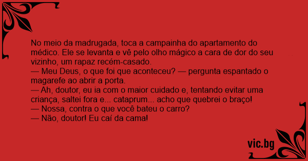 No meio da madrugada, toca a campainha do apartamento do médico. Ele se levanta e vê pelo olho mágico a cara de dor do seu vizinho, um rapaz recém-casado.
