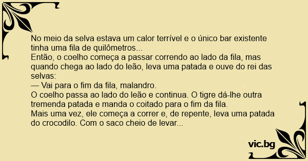 No meio da selva estava um calor terrível e o único bar existente tinha uma fila de quilômetros...