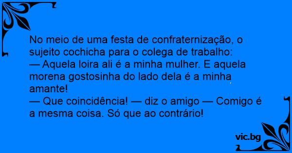 — Que coincidência! — diz o amigo — Comigo é a mesma coisa. Só que ao contrário!