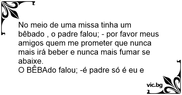 No meio de uma missa tinha um bêbado , o padre falou; - por favor meus amigos quem me prometer que nunca mais irá beber e nunca mais fumar se abaixe.