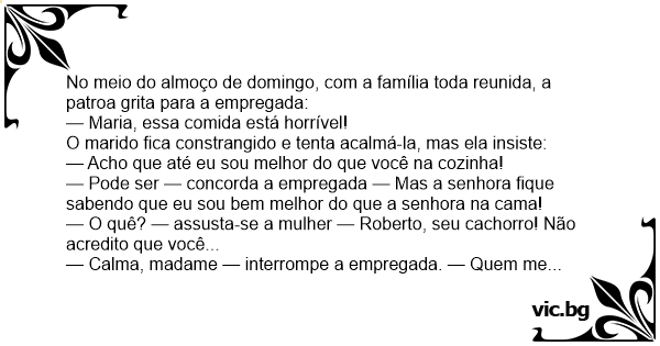 — Pode ser — concorda a empregada — Mas a senhora fique sabendo que eu sou bem melhor do que a senhora na cama!