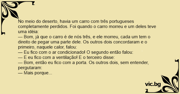 No meio do deserto, havia um carro com três portugueses completamente perdidos. Foi quando o carro morreu e um deles teve uma idéia: