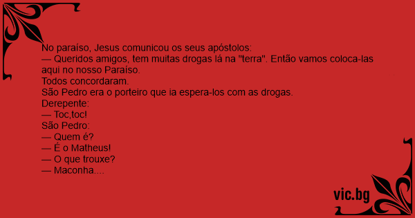 — Queridos amigos, tem muitas drogas lá na "terra". Então vamos coloca-las aqui no nosso Paraíso.