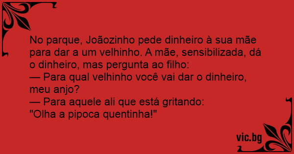 No parque, Joãozinho pede dinheiro à sua mãe para dar a um velhinho. A mãe, sensibilizada, dá o dinheiro, mas pergunta ao filho: