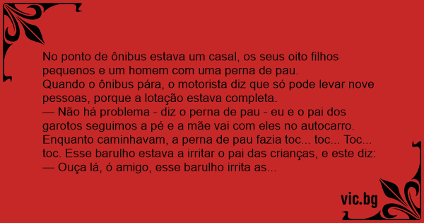 No ponto de ônibus estava um casal, os seus oito filhos pequenos e um homem com uma perna de раu.
