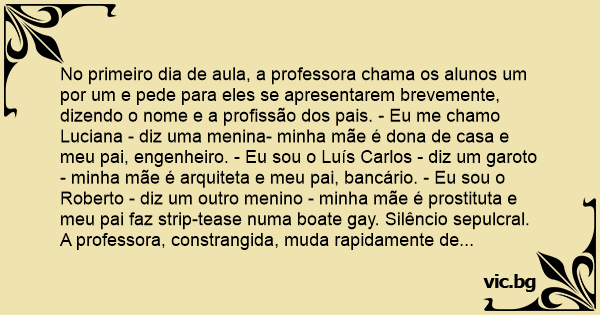 No primeiro dia de aula, a professora chama os alunos um por um e pede para eles se apresentarem brevemente, dizendo o nome e a profissão dos pais. - Eu me chamo Luciana - diz uma menina- minha mãe é dona de casa e meu pai, engenheiro. - Eu sou o Luís Carlos - diz um garoto - minha mãe é arquiteta e meu pai, bancário. - Eu sou o Roberto - diz um outro menino - minha mãe é prostituta e meu pai faz sтriр-tease numa boate gаy. Silêncio sepulcral. A professora, constrangida, muda rapidamente de assunto. No recreio, os colegas perguntam para Roberto:
