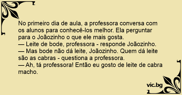 — Mas bode não dá leite, Joãozinho. Quem dá leite são as cabras - questiona a professora.