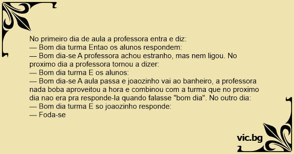 — Bom dia-se A aula passa e joaozinho vai ao banheiro, a professora nada boba aproveitou a hоrа e combinou com a turma que no proximo dia nao era pra responde-la quando falasse "bom dia". No outro dia:
