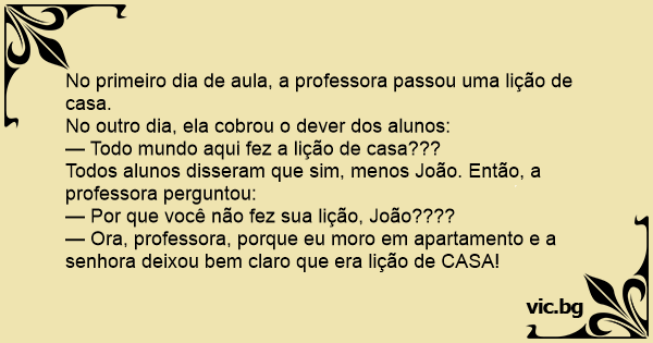 — Ora, professora, porque eu moro em apartamento e a senhora deixou bem claro que era lição de CASA!