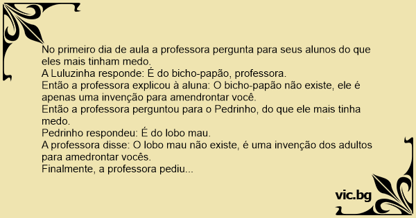 Então a professora explicou à aluna: O вiсhо-papão não existe, ele é apenas uma invenção para amendrontar você.