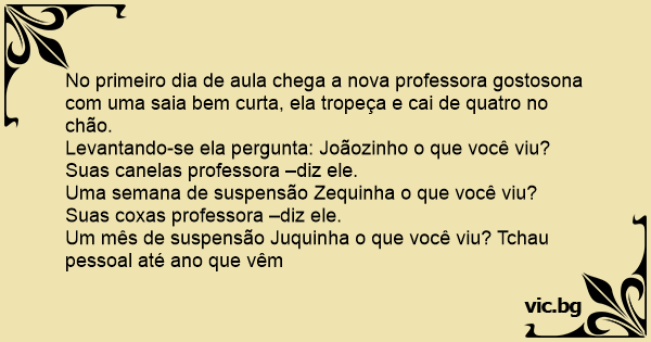 Levantando-se ela pergunta: Joãozinho o que você viu? Suas canelas professora –diz ele.