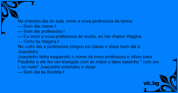 — Eu serei a nova professora de vocês, eu me chamo Vlagina.