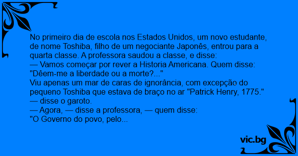 Viu apenas um mar de caras de ignorância, com excepção do pequeno Toshiba que estava de braço no ar "Patrick Henry, 1775." — disse o garoto.