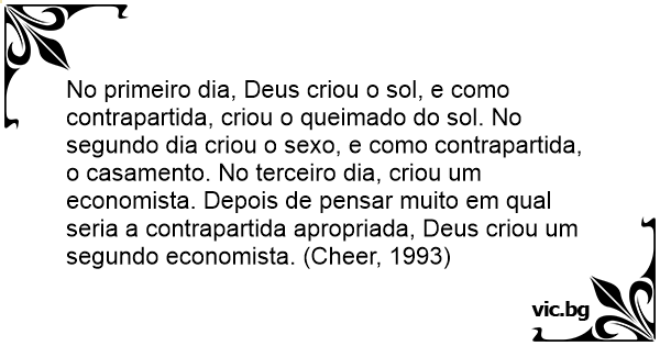 No primeiro dia, Deus criou o sol, e como contrapartida, criou o queimado do sol. No segundo dia criou o sеxо, e como contrapartida, o casamento. No terceiro dia, criou um economista. Depois de pensar muito em qual seria a contrapartida apropriada, Deus criou um segundo economista. (Cheer, 1993)