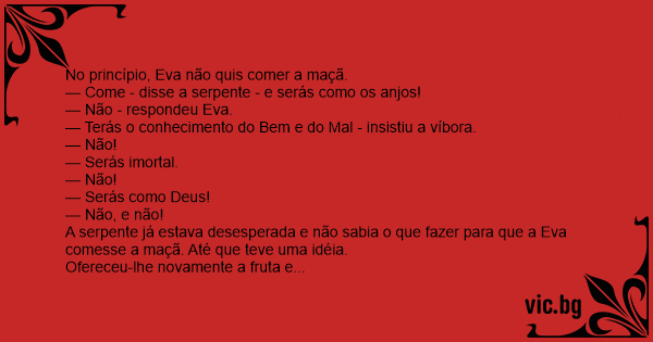 A serpente já estava desesperada e não sabia o que fazer para que a Eva comesse a maçã. Até que teve uma idéia.