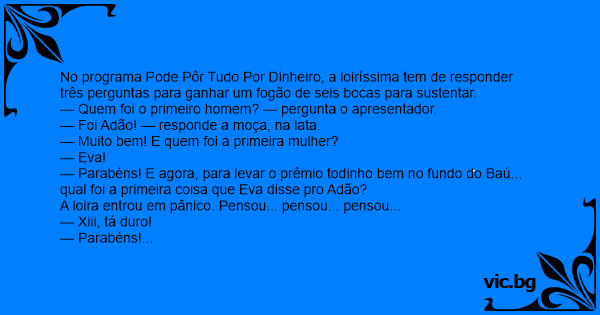 — Parabéns! E agora, para levar o prêmio todinho bem no fundo do Baú... qual foi a primeira coisa que Eva disse pro Adão?