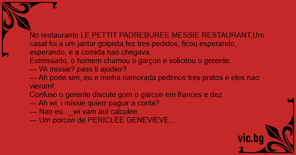 No restaurante LE PETTIT PADREBUREE MESSIE RESTAURANT,Um casal foi a um jantar golpista,fez tres pedidos, ficou esperando, esperando, e a comida nao chegava.