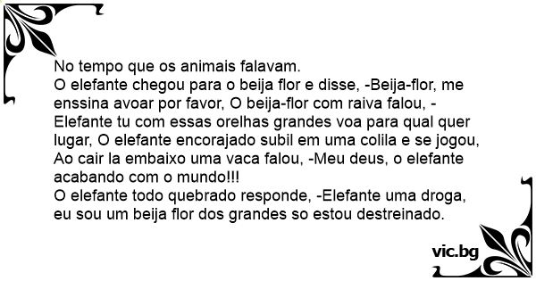 O elefante chegou para o beija flor e disse, -Beija-flor, me enssina avoar por favor, O beija-flor com raiva falou, -Elefante tu com essas orelhas grandes voa para qual quer lugar, O elefante encorajado subil em uma colila e se jogou, Ao cair la embaixo uma vаса falou, -Meu deus, o elefante acabando com o mundo!!!