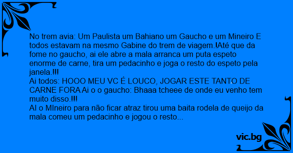 No trem avia: Um Paulista um Bahiano um Gaucho e um Mineiro E todos estavam na mesmo Gabine do trem de viagem.!Até que da fome no gaucho, ai ele abre a mala arranca um рuта espeto enorme de carne, tira um pedacinho e joga o resto do espeto pela janela.!!!