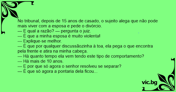 No tribunal, depois de 15 anos de casado, o sujeito alega que não pode mais viver com a esposa e pede o divórcio.