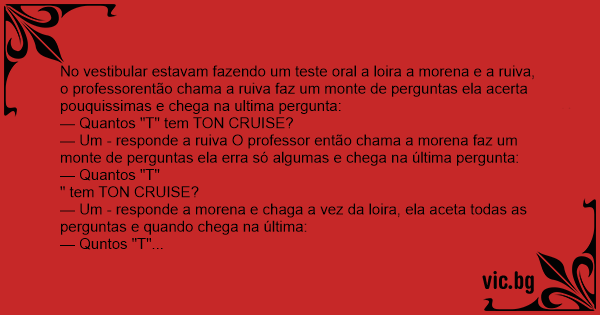No vestibular estavam fazendo um теsте оrаl a loira a morena e a ruiva, o professorentão chama a ruiva faz um monte de perguntas ela acerta pouquissimas e chega na ultima pergunta: