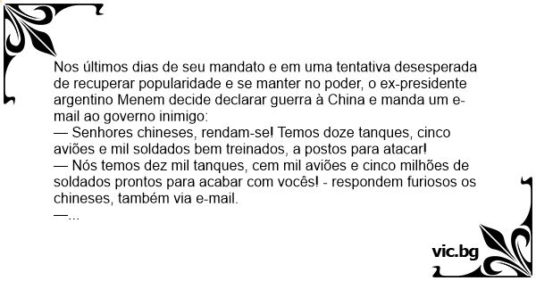 Nos últimos dias de seu mandato e em uma tentativa desesperada de recuperar popularidade e se manter no poder, o ex-presidente argentino Menem decide declarar guerra à China e manda um e-mail ao governo inimigo: