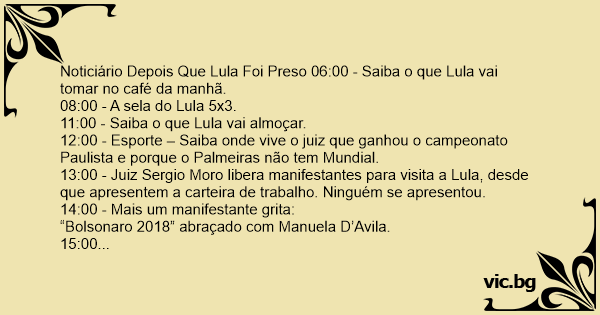 Noticiário Depois Que Lula Foi Preso 06:00 - Saiba o que Lula vai tomar no café da manhã.