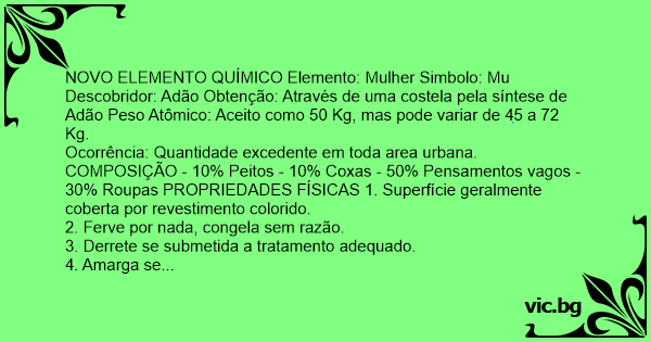 NOVO ELEMENTO QUÍMICO Elemento: Mulher Simbolo: Mu Descobridor: Adão Obtenção: Através de uma costela pela síntese de Adão Peso Atômico: Aceito como 50 Kg, mas pode variar de 45 a 72 Kg.