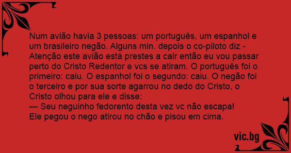 Num avião havia 3 pessoas: um português, um espanhol e um brasileiro negão. Alguns min. depois o co-piloto diz - Atenção este avião está prestes a cair então eu vou passar perto do Cristo Redentor e vcs se atiram. O português foi o primeiro: caiu. O espanhol foi o segundo: caiu. O negão foi o terceiro e por sua sorte agarrou no dedo do Cristo, o Cristo olhou para ele e disse: