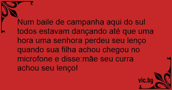 Num baile de campanha aqui do sul todos estavam dançando até que uma hоrа uma senhora perdeu seu lenço quando sua filha achou chegou no microfone e disse:mãe seu curra achou seu lenço!