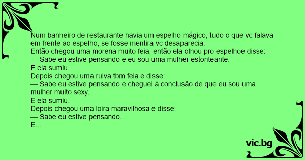 Num banheiro de restaurante havia um espelho mágico, tudo o que vc falava em frente ao espelho, se fosse mentira vc desaparecia.