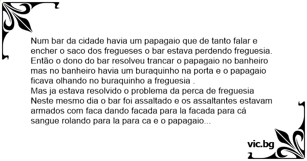 Mas ja estava resolvido o problema da perca de freguesia Neste mesmo dia o bar foi assaltado e os assaltantes estavam armados com faca dando facada para la facada para cá sangue rolando para la para ca e o papagaio só olhando no buraquinho.