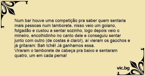Num bar houve uma competição pra saber quem sentaria mais pessoas num tamborete, nisso veio um goiano, folgadão e custou a sentar sozinho, logo depois veio o mineiro, encolhidinho no canto dele e conseguiu sentar junto com outro (de costas é claro!), aí vieram os gaúchos e já gritaram: Bah tchê! Já ganhamos essa.