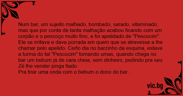 Num bar, um sujeito malhado, bombado, sarado, vitaminado, mas que por conta de tanta malhação acabou ficando com um corpão e o pescoço muito fino, e foi apelidado de "Pescocim".
