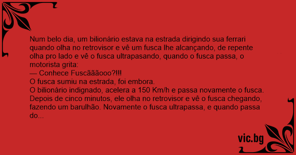 Num belo dia, um bilionário estava na estrada dirigindo sua ferrari quando olha no retrovisor e vê um fusca lhe alcançando, de repente olha pro lado e vê o fusca ultrapasando, quando o fusca passa, o motorista grita:
