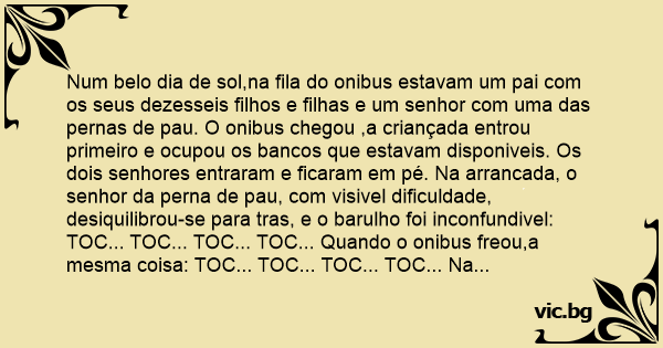 Num belo dia de sol,na fila do onibus estavam um pai com os seus dezesseis filhos e filhas e um senhor com uma das pernas de раu. O onibus chegou ,a criançada entrou primeiro e ocupou os bancos que estavam disponiveis. Os dois senhores entraram e ficaram em pé. Na arrancada, o senhor da perna de раu, com visivel dificuldade, desiquilibrou-se para tras, e o barulho foi inconfundivel: TOC... TOC... TOC... TOC... Quando o onibus freou,a mesma coisa: TOC... TOC... TOC... TOC... Na arrancada,novamente: TOC... TOC... TOC.. TOC... E assim foi, varias vezes...