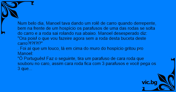 Num belo dia, Manoel tava dando um rolê de carro quando derrepente, bem na frente de um hospício os parafusos de uma das rodas se solta do carro e a roda sai rolando rua abaixo. Manoel desesperado diz: