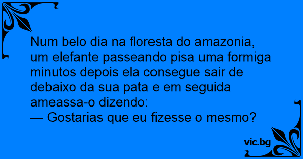 Num belo dia na floresta do amazonia, um elefante passeando pisa uma formiga minutos depois ela consegue sair de debaixo da sua pata e em seguida ameassa-o dizendo:
