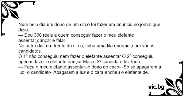 — Faça o meu elefante assentar.-o dono do circo- -Só se apagarem a luz.-o candidato- Apagaram a luz e o cara encheu o elefante de porrada. Aí o elefante assentou,pois não conseguia ficar de pé.