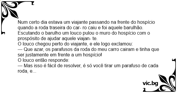 Num certo dia estava um viajante passando na frente do hospício quando a roda traseira do car- ro caiu e foi aquele barulhão.