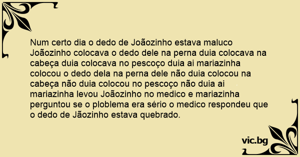 Num certo dia o dedo de Joãozinho estava maluco Joãozinho colocava o dedo dele na perna duia colocava na cabeça duia colocava no pescoço duia ai mariazinha colocou o dedo dela na perna dele não duia colocou na cabeça não duia colocou no pescoço não duia ai mariazinha levou Joãozinho no medico e mariazinha perguntou se o ploblema era sério o medico respondeu que o dedo de Jãozinho estava quebrado.