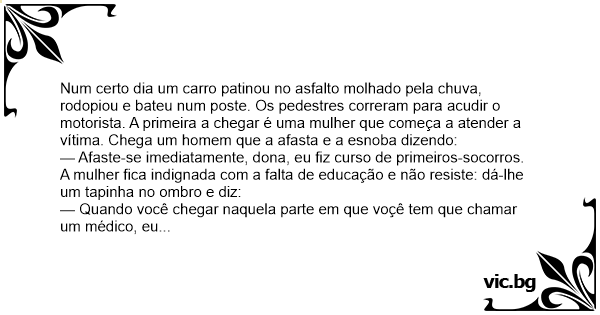 Num certo dia um carro patinou no asfalto molhado pela chuva, rodopiou e bateu num poste. Os pedestres correram para acudir o motorista. A primeira a chegar é uma mulher que começa a atender a vítima. Chega um homem que a afasta e a esnoba dizendo: