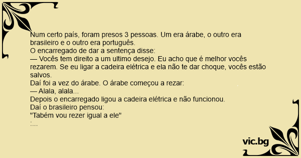 Num certo país, foram presos 3 pessoas. Um era árabe, o outro era brasileiro e o outro era português.