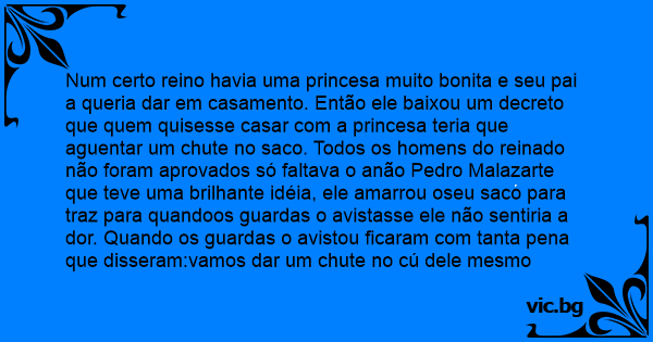 Num certo reino havia uma princesa muito bonita e seu pai a queria dar em casamento. Então ele baixou um decreto que quem quisesse casar com a princesa teria que aguentar um chute no saco. Todos os homens do reinado não foram aprovados só faltava o anão Pedro Malazarte que teve uma brilhante idéia, ele amarrou oseu saco para traz para quandoos guardas o avistasse ele não sentiria a dor. Quando os guardas o avistou ficaram com tanta pena que disseram:vamos dar um chute no cú dele mesmo