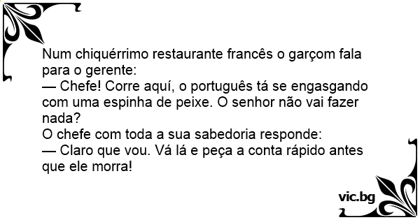 — Chefe! Corre aquí, o português tá se engasgando com uma espinha de peixe. O senhor não vai fazer nada?