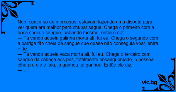 Num concurso de morcegos, estavam fazendo uma disputa para ver quem era melhor para сhuраr sague. Chega o primeiro com a boca cheia e sangue, babando mesmo, entra e diz: