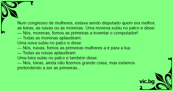 Num congresso de mulheres, estava sendo disputado quem era melhor, as loiras, as ruivas ou as morenas. Uma morena subiu no palco e disse: