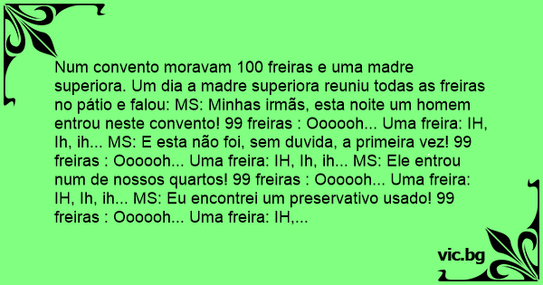 Num convento moravam 100 freiras e uma madre superiora. Um dia a madre superiora reuniu todas as freiras no pátio e falou: MS: Minhas irmãs, esta noite um homem entrou neste convento! 99 freiras : Oooooh... Uma freira: IH, Ih, ih... MS: E esta não foi, sem duvida, a primeira vez! 99 freiras : Oooooh... Uma freira: IH, Ih, ih... MS: Ele entrou num de nossos quartos! 99 freiras : Oooooh... Uma freira: IH, Ih, ih... MS: Eu encontrei um preservativo usado! 99 freiras : Oooooh... Uma freira: IH, Ih, ih... MS: E este preservativo estava furado! Uma freira : Oooooh... 99 freiras : IH, Ih, ih...